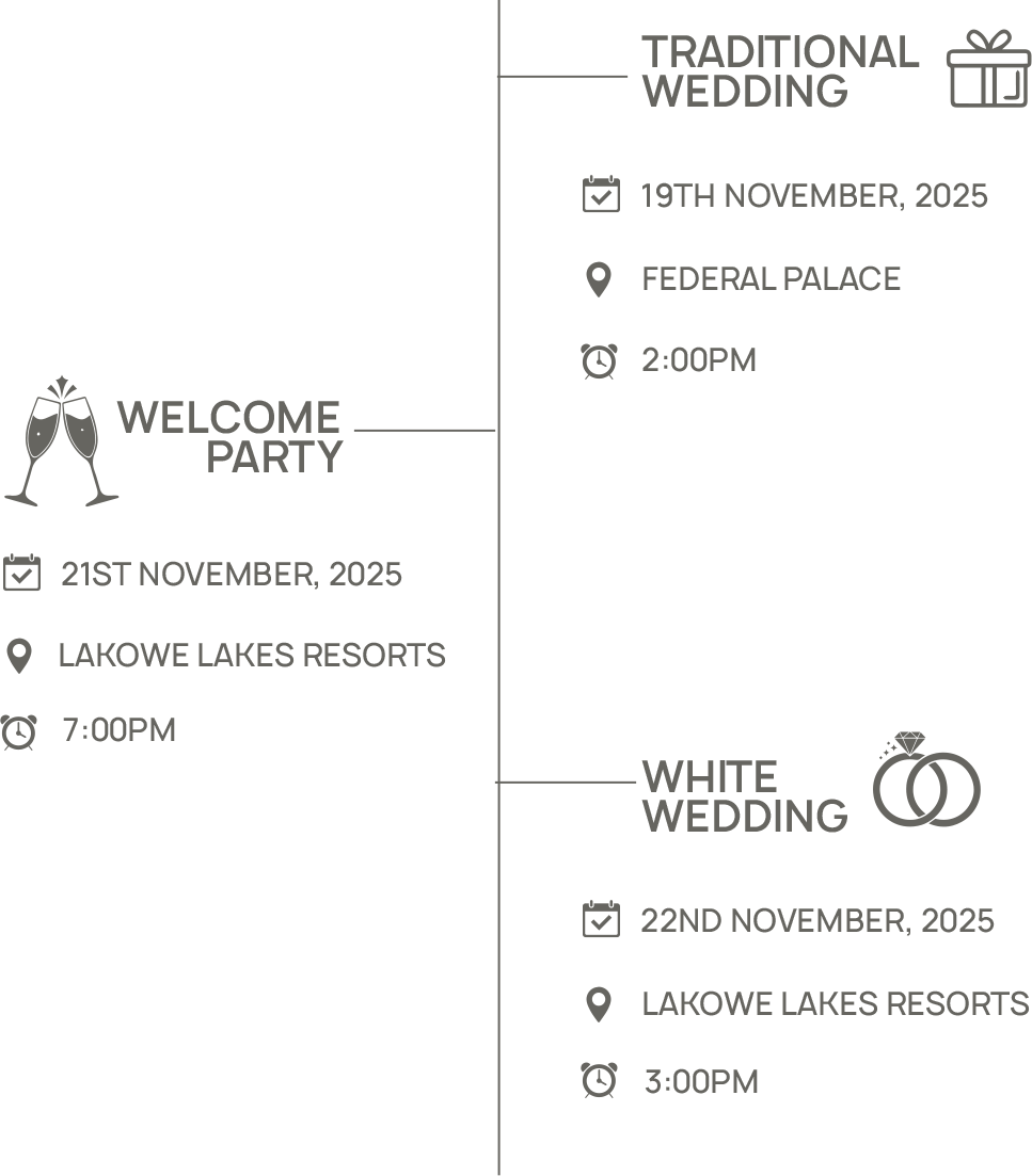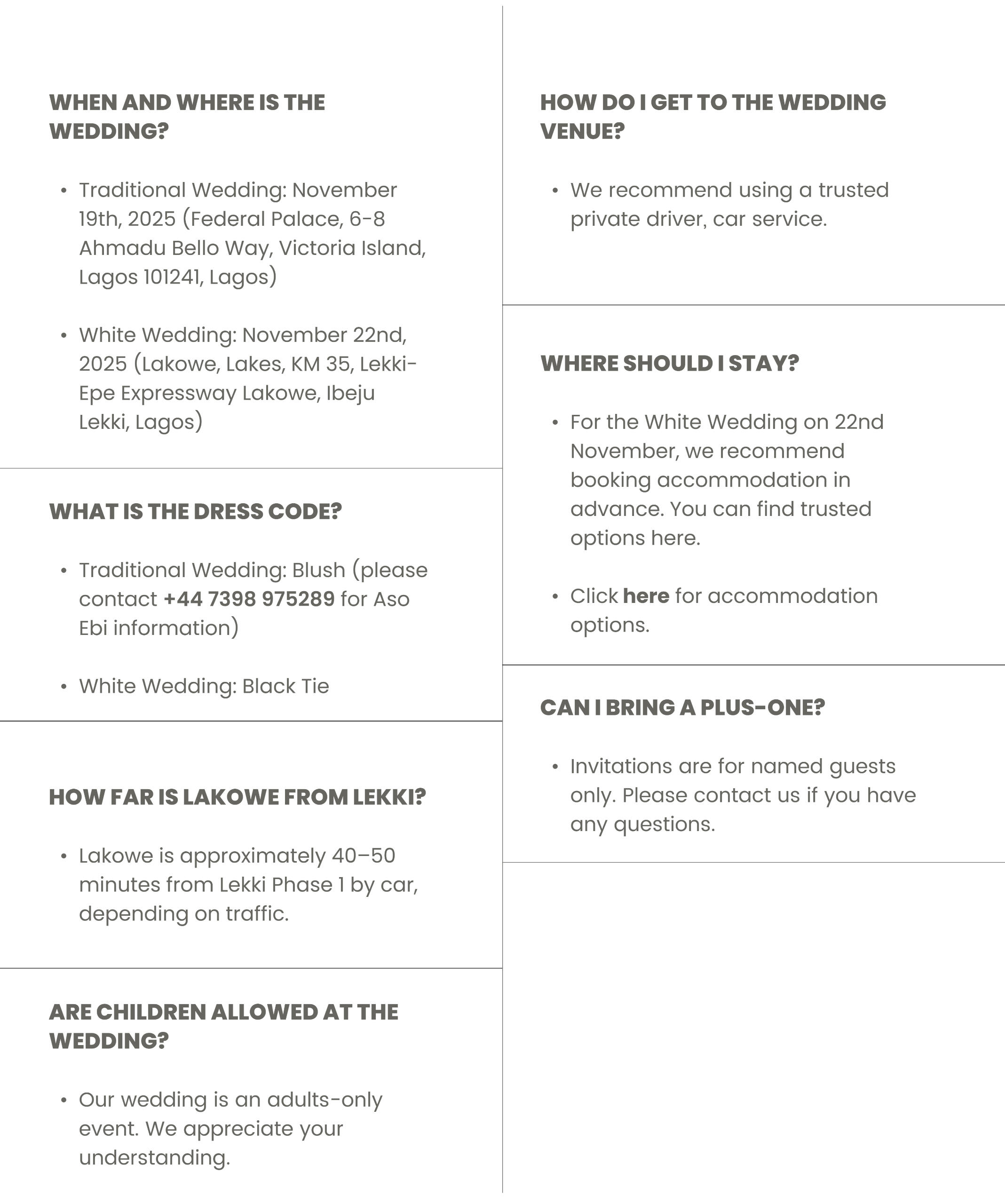Welcome to Our Wedding Website!Dear Family and Friends,We are so excited to celebrate our special day with you in Lagos, Nigeria! Your love and support mean the world to us, and we truly appreciate the effort you’re making to join us for this unforgettable occasion.As we count down the months to our wedding, this website will serve as your go-to guide for all the details—our schedule of events, travel and accommodation recommendations, and everything you need to make your trip smooth and enjoyable. Whether you’re traveling from near or far, we want this to be not just a celebration of love but also a memorable experience for you.Thank you for being part of our journey—we can’t wait to celebrate with you!